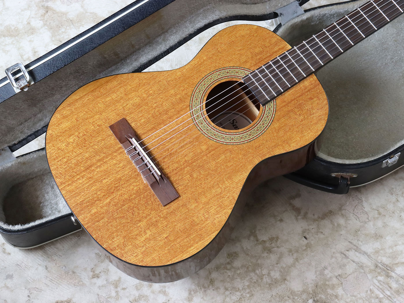 美しいトップ材とサウンドホールの華やかな模様が目を惹く一本!