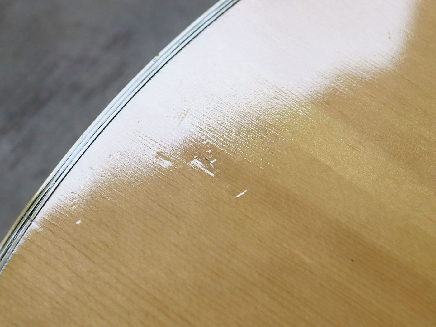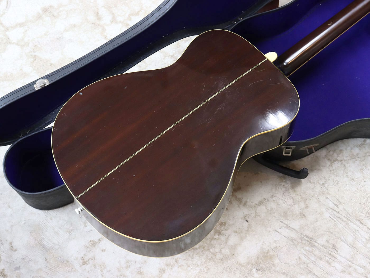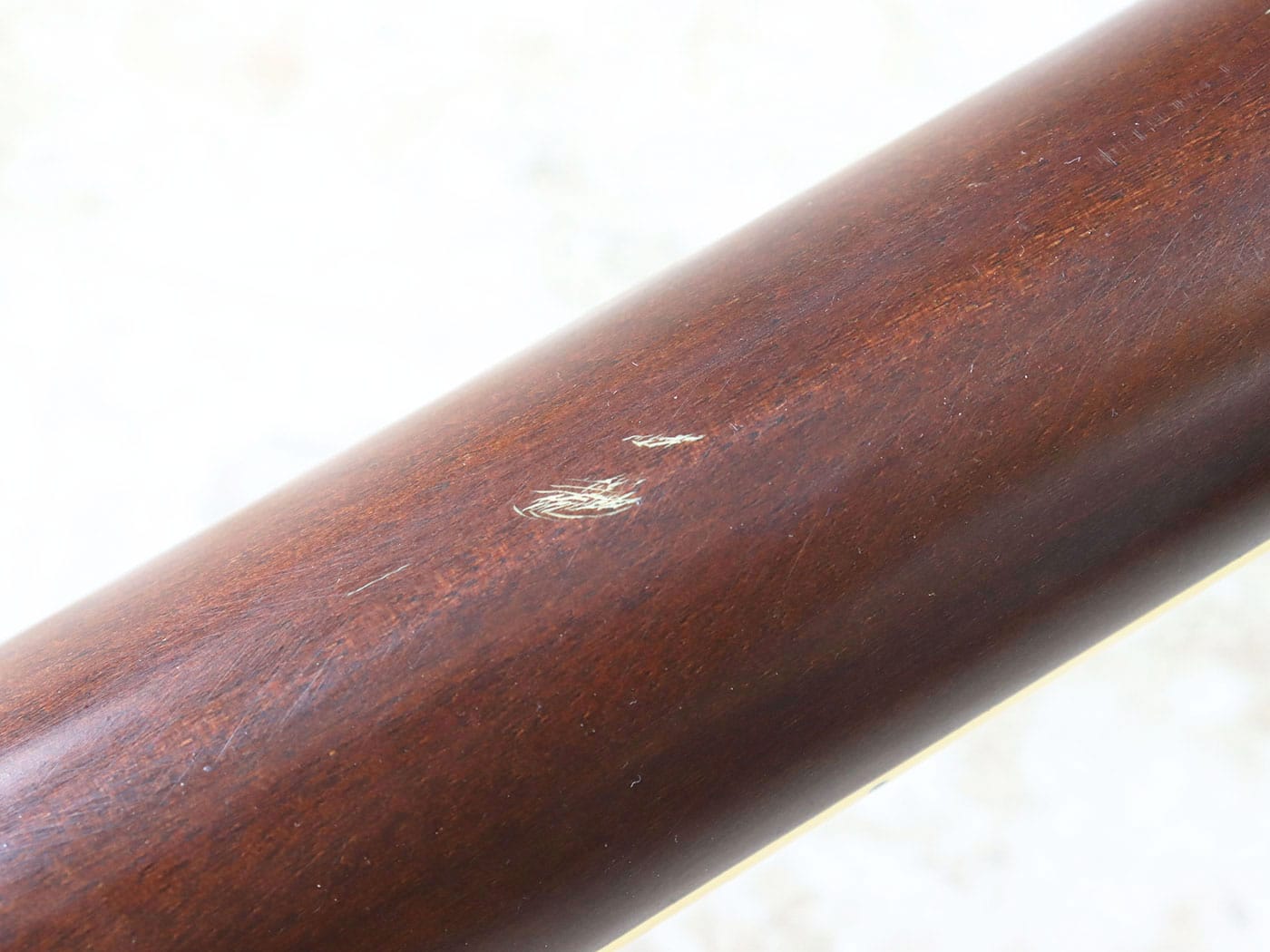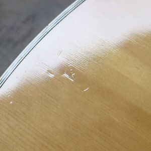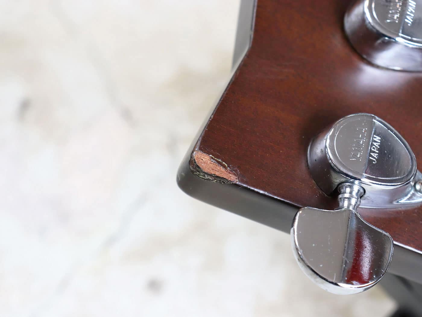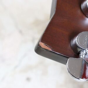 写真のようにヘッド裏4弦ペグ付近の木部の欠け、ネックの小傷、ボディの打痕、そのほか細かな傷がありますが、演奏に際して支障はございません。