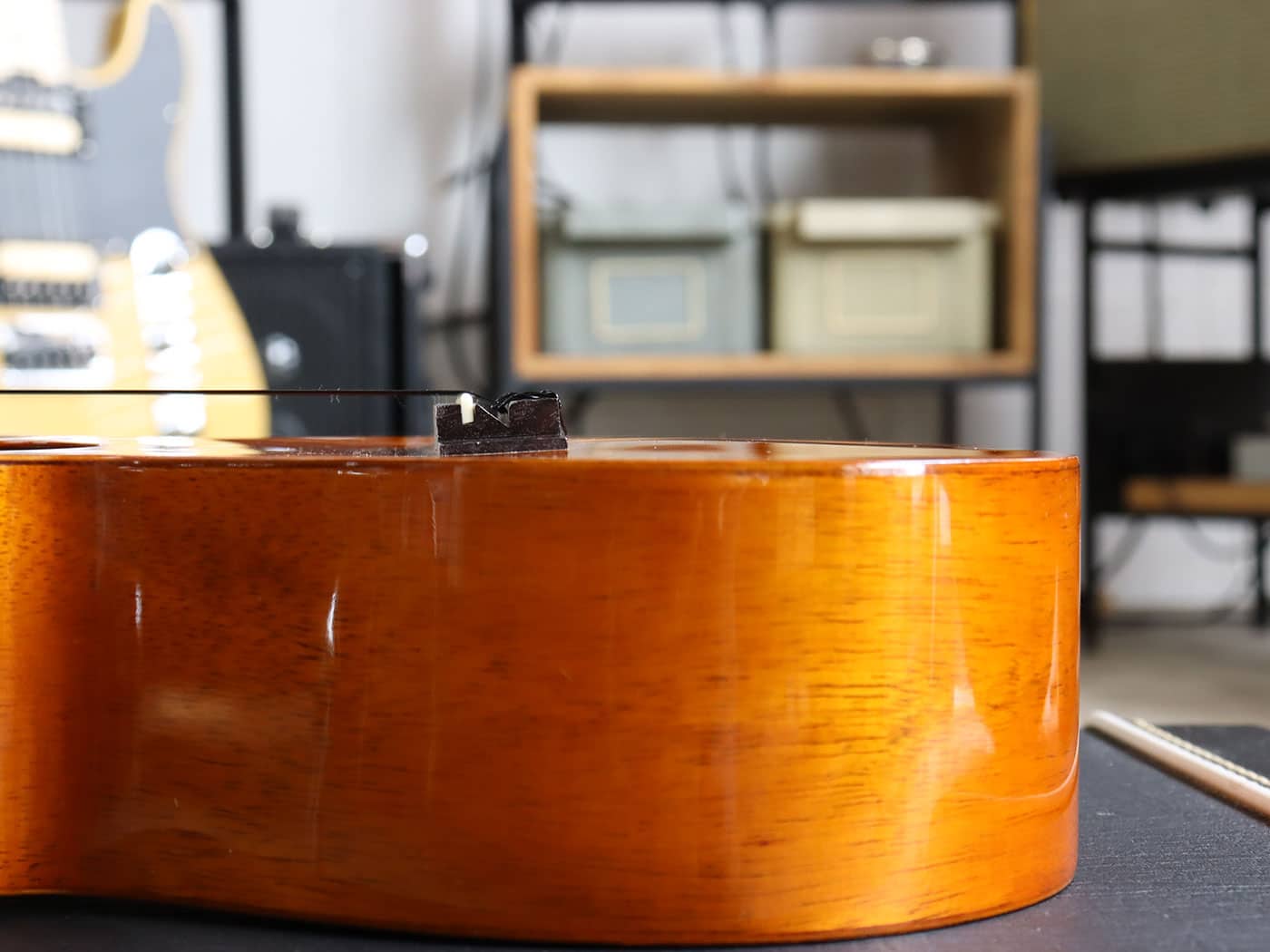 写真のようにトップ浮きがあり、弦高が高めになっておりますがブリッジ剥がれはございません。