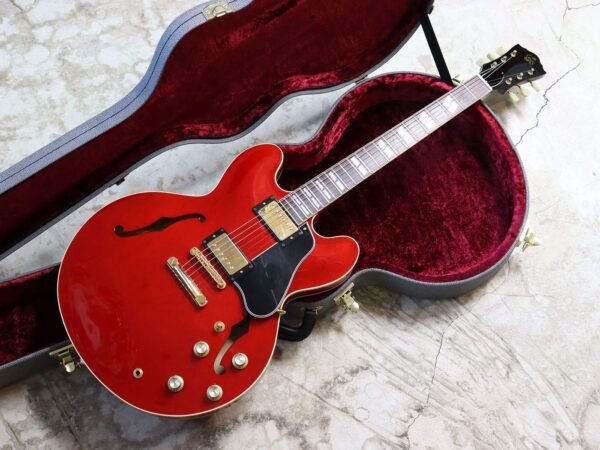 ES-335のハードウェアをゴールドパーツに、インレイがダブルパラレログラムインレイになり、ES-345と足して2で割ったかのようなゴージャスなルックス、ジャジーな温かみのあるクリーンからハードロック的なガッツのある歪みまでしっかりこなしてくれるサウンド、標準的な弦高ながらとても弾きやすいネックと、見た目良し、音良し、演奏性良しの三拍子揃った一本です。